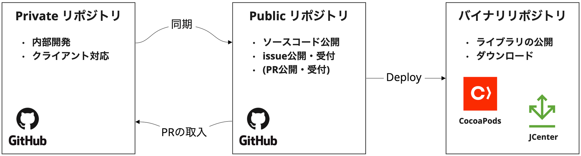 開発中の新機能や特定クライアントのissue等の開示は難しいため、当面はそれらの開発プロセスはPrivateにすることにしています。適切に公開範囲をコントロールするため、開発・リリースフローを次のリポジトリ・CI構成で行うことにしました。