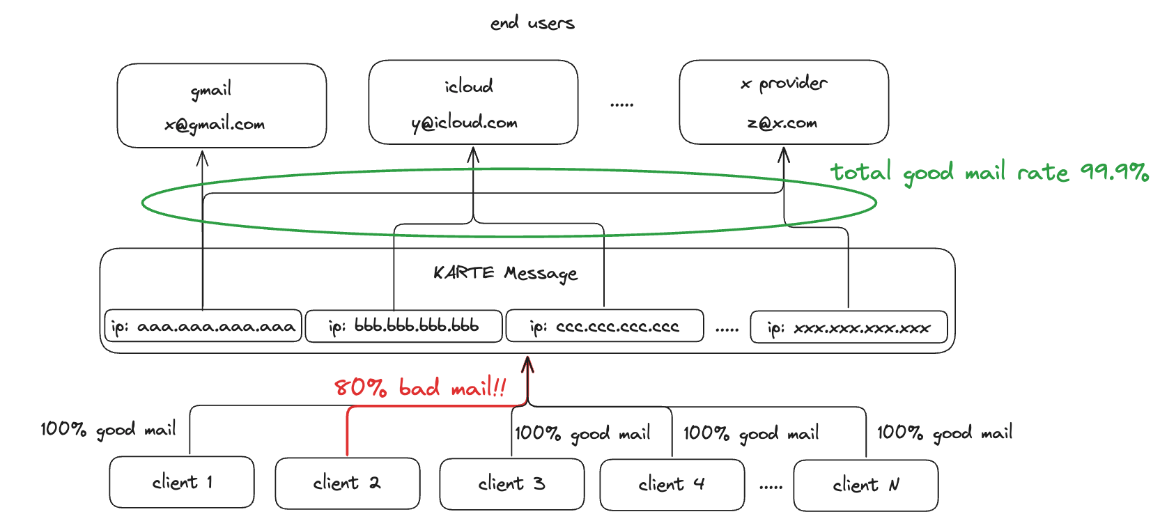 結果として冒頭で述べた通り、KARTE Messageを利用しているクライアント全配信量が母数となるので、特定のクライアントで質の低いメールが多少送信されても影響を小さくすることができます。