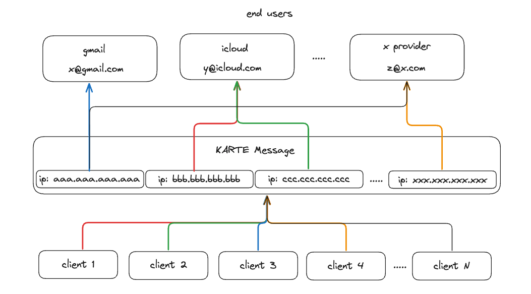 KARTE Messageでは、それを実現する仕組みとしてマルチテナントなメール配信を行なっており、KARTE Messageが所有しているIPアドレスをクライアントごとに固定せず、全てのIPに均等に振り分けて送信しています。