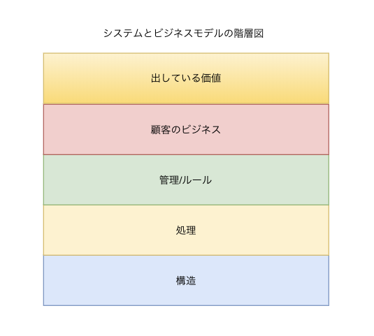 システムとビジネスを取り巻く環境は「価値、顧客のビジネス、管理/ ルール、処理、構造」を構成要素として把握することができます。構造(アーキテクチャ)を構築して、処理(ソースコード)として記載し、管理(インプットから出力されるアウトプットデータの管理)します。そこに顧客のビジネスが乗り価値が生まれる。このモデルを元に各ビジネスとシステムの構造を考えます。