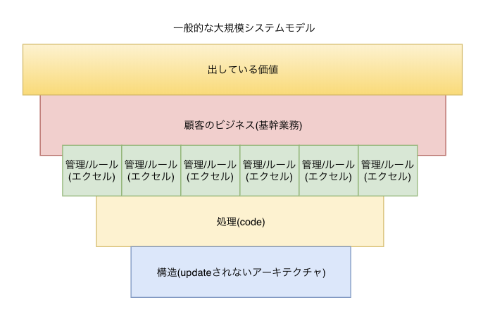 また、増える仕様を管理するためにエクセルでの管理資料を増大させることになります。顧客のビジネス要件を満たすきめ細やかな処理を追加するたびにシステムやその管理が増大し、図の各階層のバランスが肥大化するようになります。