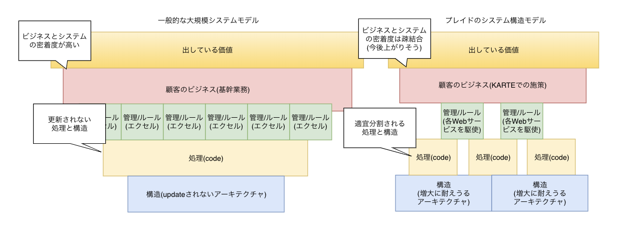 既存のデータを守りつつ構造と処理を変革させることが必要ですが、受託大規模開発と比べKARTEは汎用的な業務を提案していくスタイルなので、顧客業務との密着度を疎結合的にそのままキープしつつ、開発スピードを上げていくことが事業の価値と直結すると私は考えています。少なくとも密着度を上げすぎるような特定の顧客向けに個別の実装をするなどは避けたいと思っています。
