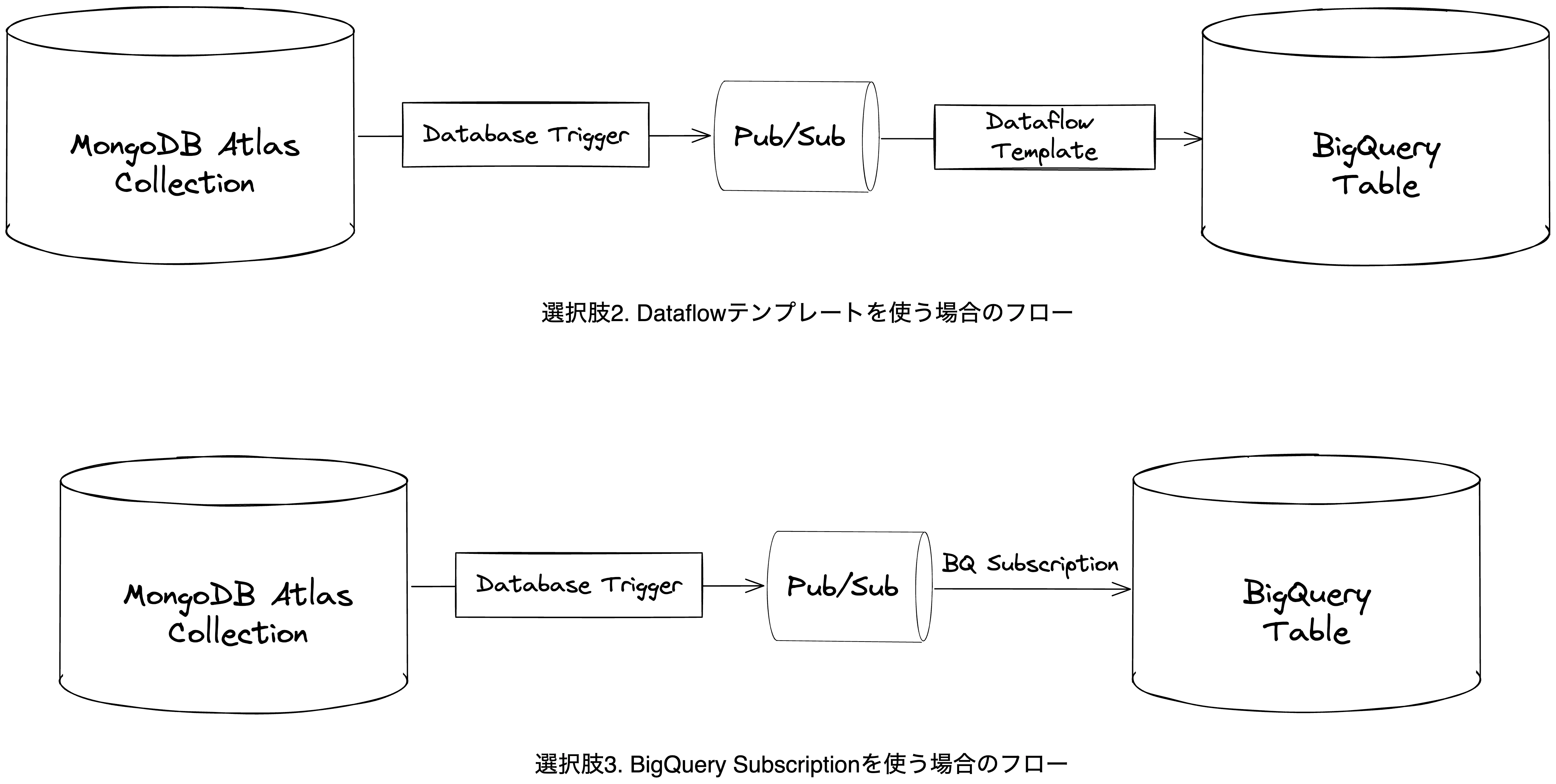 選択肢2のDataflowテンプレートと同様にMongoDBコレクション to Pub/Subの部分は自ら実装する必要がありますが、Pub/Sub to BigQueryテーブルの部分はDataflowを使う必要がないため一つコンポーネントが減り、よりメンテナンスコストが下がるというメリットがありました。