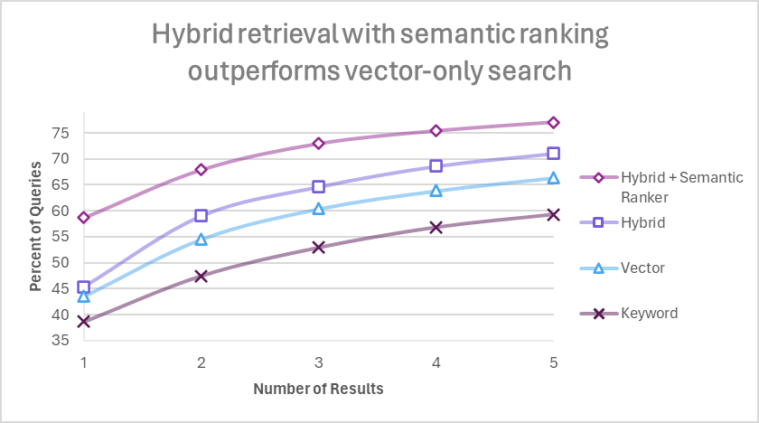 Azure AI Search では検索精度のチューニングについても多くの選択肢が用意されています。現在以下の検索モードが利用可能であり、RAG システムにおいては 1 から 4 へ行くにしたがって精度が向上していくことが Microsoft の定量分析結果で示されています。