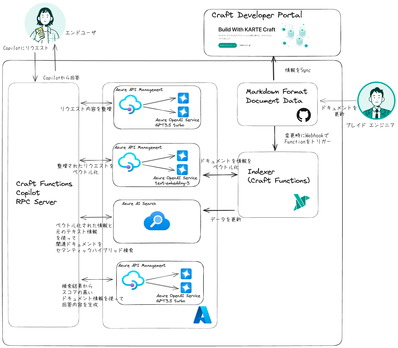 Craft Functions Copilot RPC Server(以下、RPC Server ) です。この RPC Server がオーケストレータ的に、各 Azure サービスに情報を投げて、最終回答まで整えていきます。