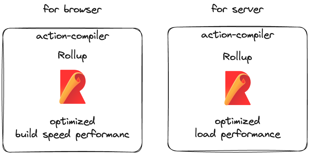 The server-oriented action-compiler bundles with Rollup and minifies with Terser (via Rollup plugin) to maximize action performance. Like the browser version, action-compiler itself is bundled, but unlike the browser version, it simply imports Rollup from node_modules rather than bundling Rollup into action-compiler.