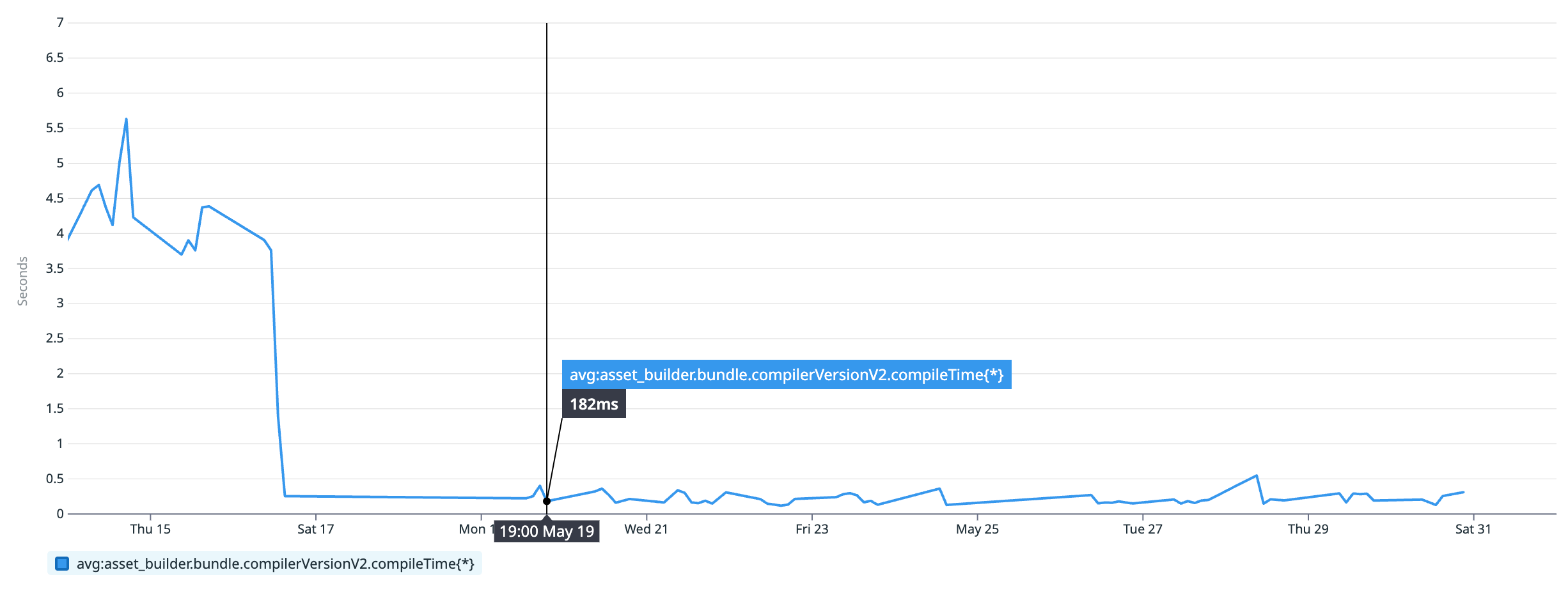 At the time of writing, we've deployed Rolldown-powered server-side action-compiler to production as a beta for select customers using Flex Editor. We continuously monitor server-side action-compiler performance with DataDog. Here's the graph after introducing Rolldown-powered action-compiler to production: