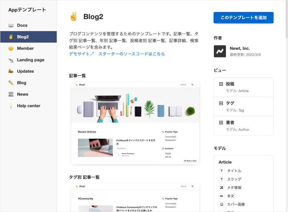 Newtでは、モデル設定とサンプルコンテンツのプリセット(Appテンプレート)をインストールしてコンテンツ管理をスタートすることができます。AppテンプレートにはそれぞれNext.jsとNuxt.jsのスターターキットが用意されているため、今回はこれをベースに実装とデザイン(デザイナーさんにも協力してもらいました)を行うことにしました。