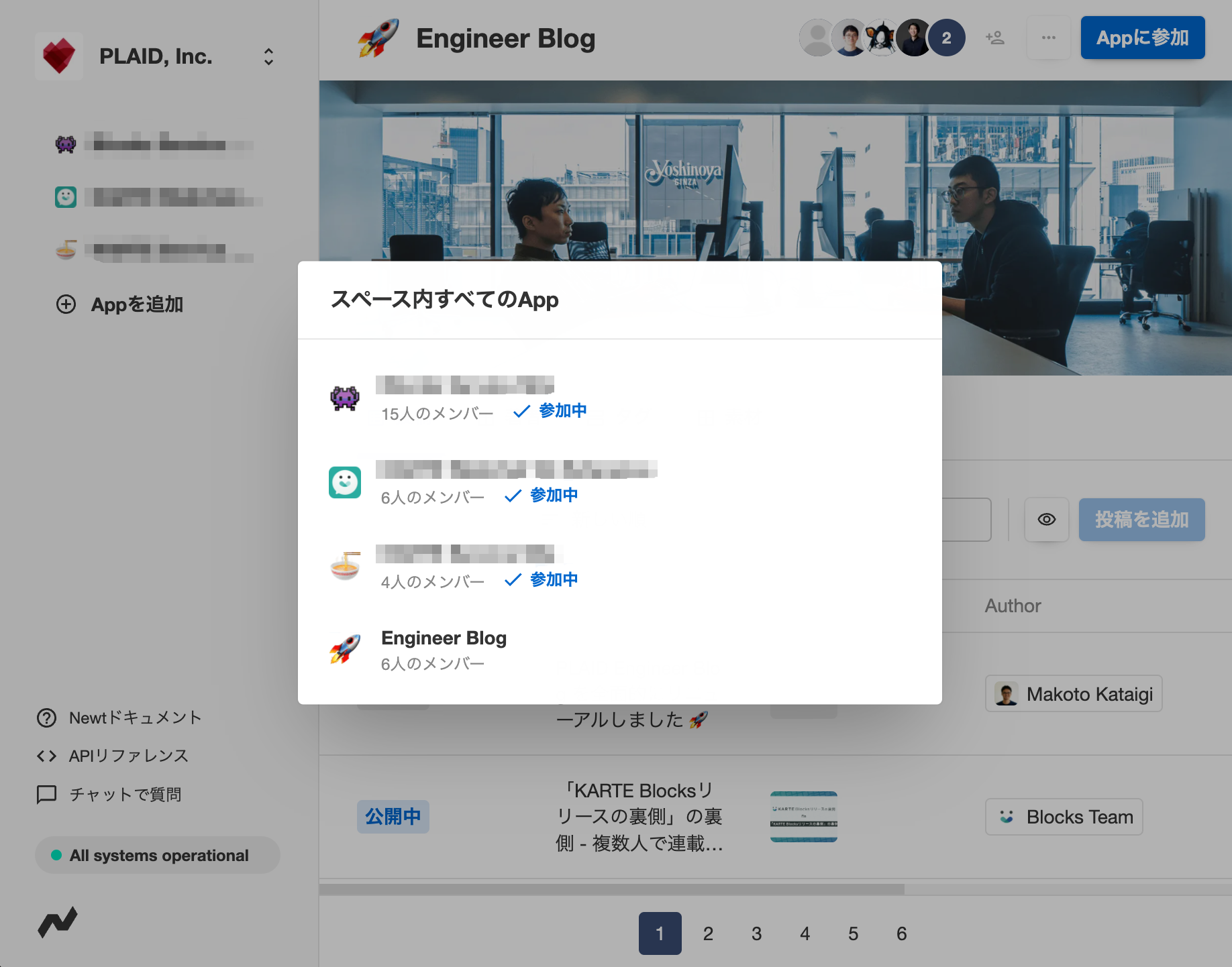 最初はエンジニアブログだけのために作成したNewtスペースですが、少し時間が経つと風の噂を聞いた他チームの社員が何人も参加してきて新たなAppが次々と作られています。