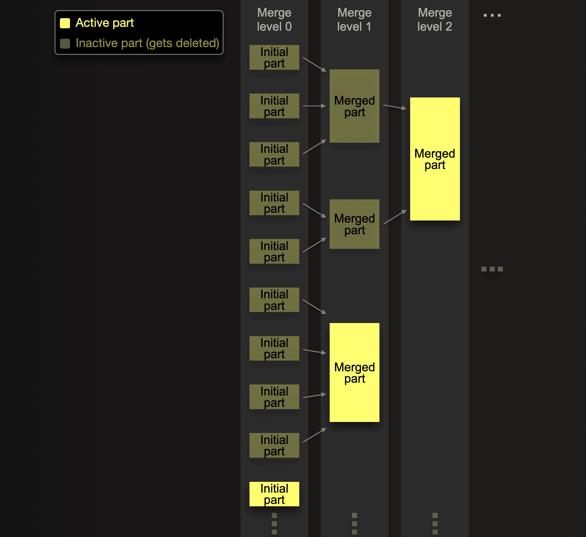 Merged partの生成は閾値(150GB)に達するまで繰り返されていく。