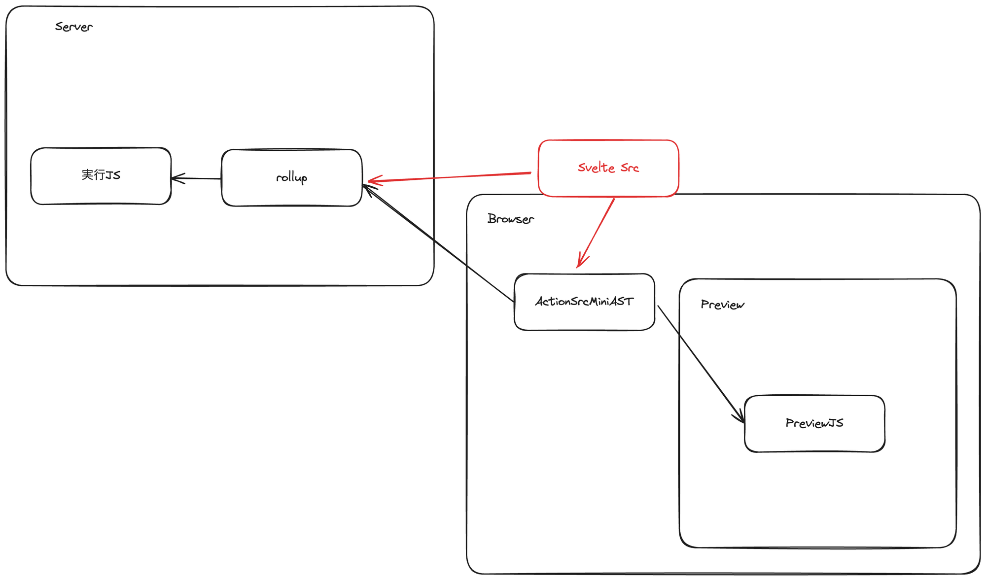 サーバーからアクションテンプレートをfetchした後、エディタ内でブラウザのメモリ内に展開されて、フロントエンド側で状態管理されます。その際、Svelteで実装されたアクションのコードは、Svelte parserによってAST (図中5) に変換 (図中4) され、エディタ側でアクションをノーコードで編集できるようアプリケーションの状態の1つとして使用されます。