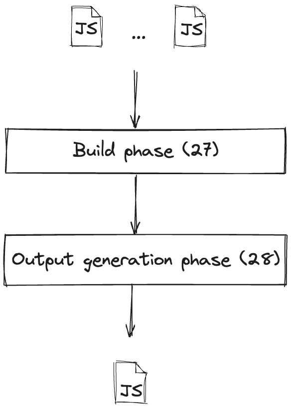 Rollupは、Buildフェーズ(図中27)そしてOutput Generationフェーズ(図中28)、主にこれら2つのフェーズを通して、JavaScriptモジュールをバンドルします。(※RollupはCSSやpngといったアセットもバンドルできます。)