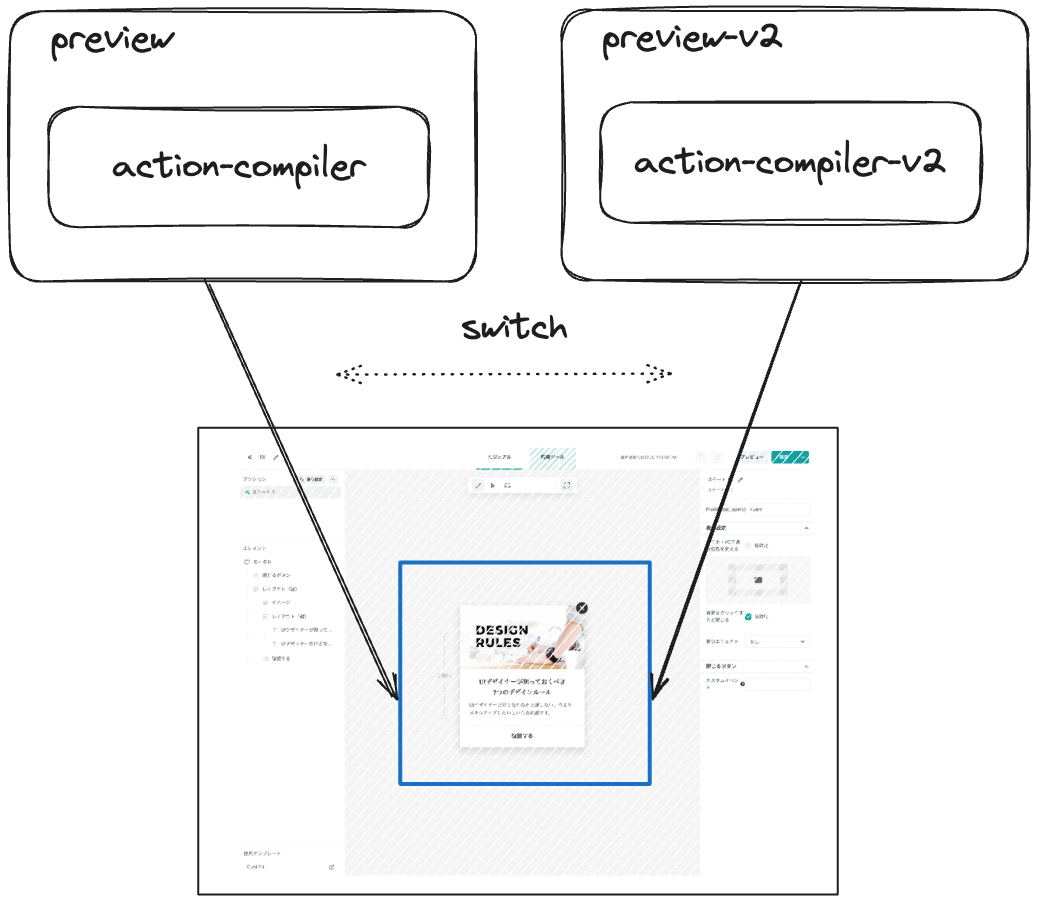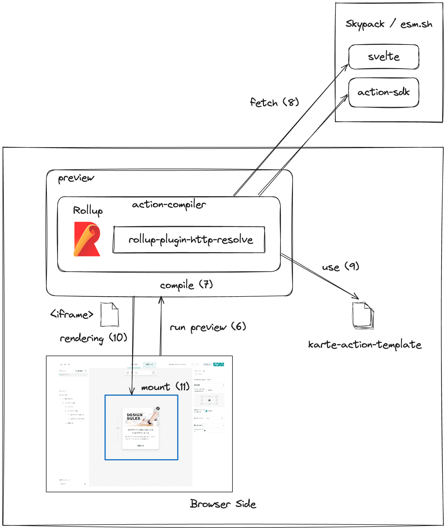 エディタは、previewのインターフェイスを介してアクションのプレビューを開始(図中6)します。previewは内部で持っているaction-compilerを使ってアクションをJavaScriptにコンパイル(図中7)します。 action-compilerは内部でRollupを使っており、previewのインターフェイスを介して渡されたアクションテンプレートをビルドします。