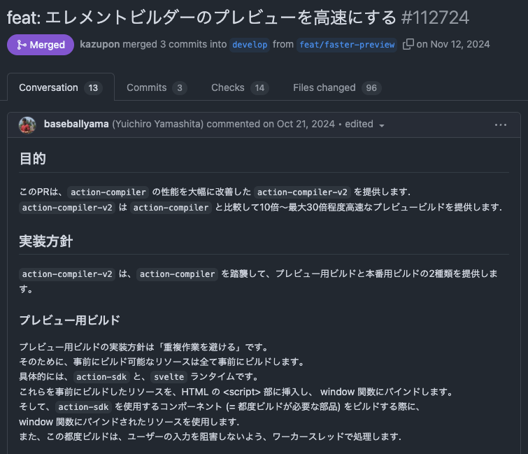 後半では、action-compilerのビルド時間を削減する方法について検討しました。その結果、事前バンドルすることでaction-sdkとsvelteをRollupのバンドルプロセスの対象から外すことで、ビルド時間削減を期待できることが分かりました。事前バンドルの案で実装して、定義した計測項目で計測したところ、Rollupのビルド時間は約10倍削減でき、そしてプレビューの遅延時間は4倍に近い形で改善できました。
