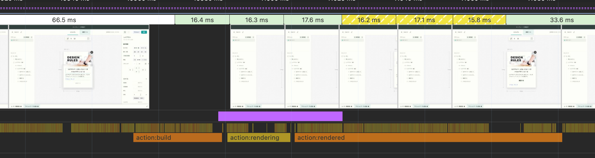 一部計測できていない部分はありますが、Performanceパネルで計測されたframes内容と、計測した項目のタイムラインがほぼ一致しています。独自測定することによって、DevTools上ひと目でプレビューのパフォーマンスを確認できるようにしました。