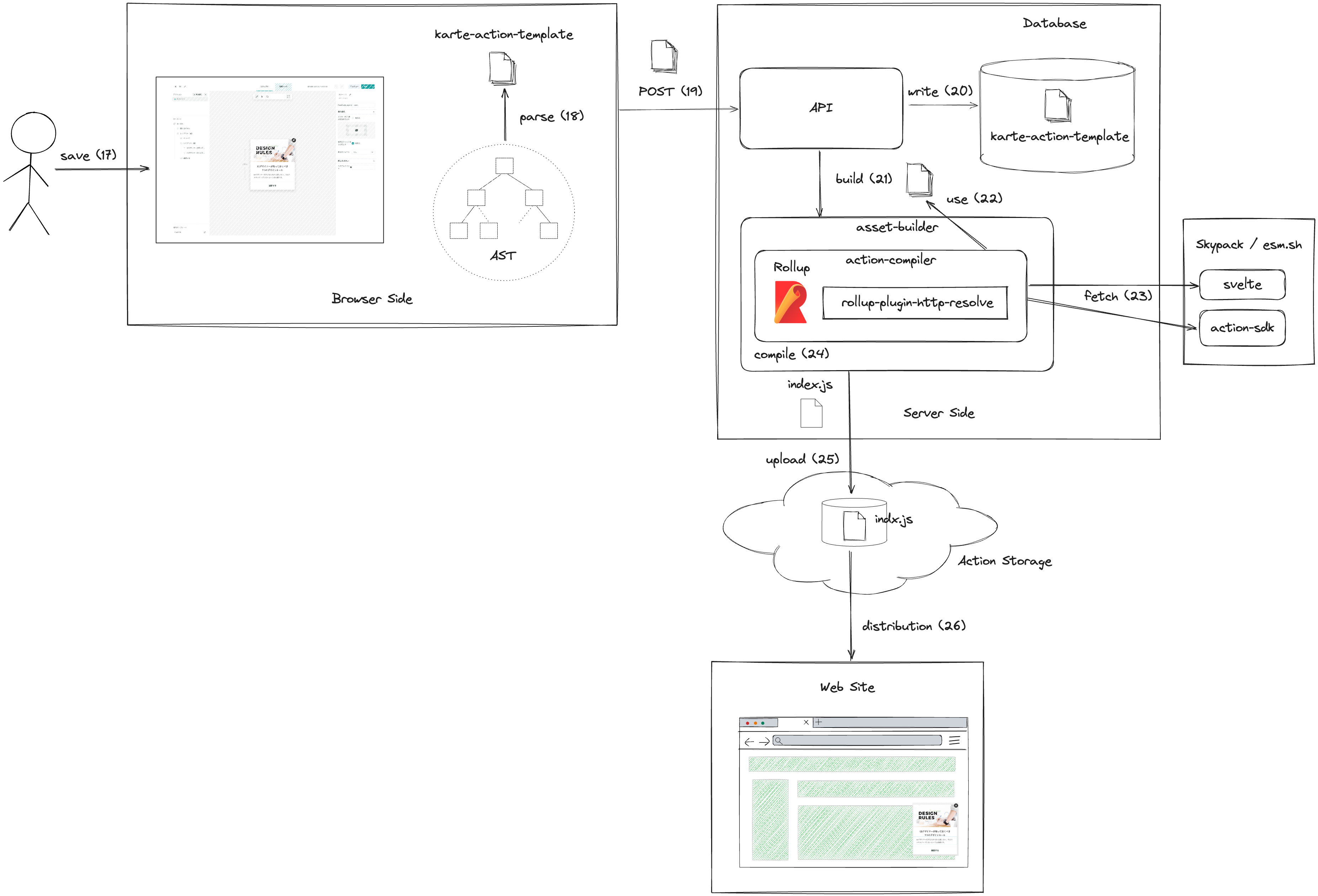 HTTP POST後、アクションテンプレートをデータベースに書き込み保存(図中20)します。それとともに、asset-builderにbuildリクエスト(図中21)して、action-compilerを使ってAPIから受け取ったアクションテンプレート (図中22)、そしてSkypack / esm.shからfetchしてきたsvelteとaction-sdkを元 (図中23)にJavaScriptコードへコンパイル(図中24)します。このコンパイル処理は、エレメントビルダーのRollupを使ったブラウザサイドと同じです。