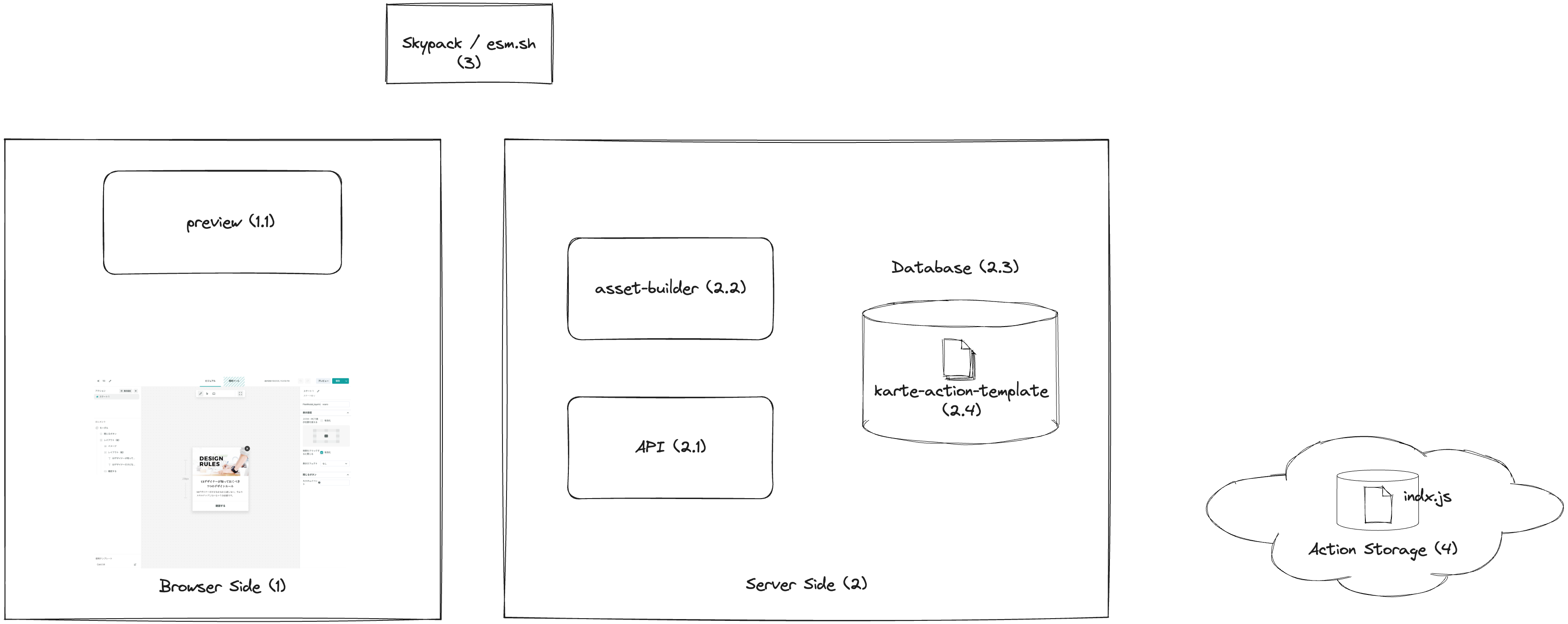 - Action Storage (図中4): asset-builderで単一のJavaScriptモジュールとしてビルドされたアクションをWebサイトに配信するための格納するストレージです