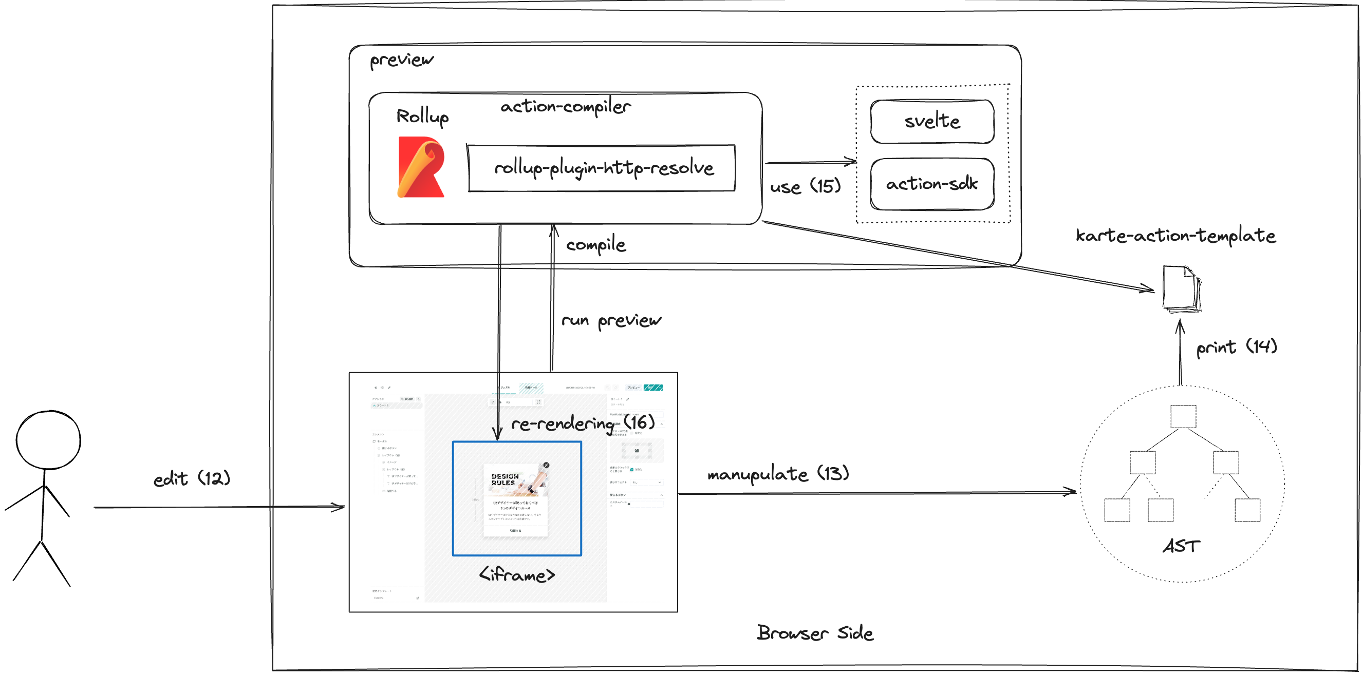 ユーザーによるエディタの操作によってアクションが編集(図中12)されると、エディタはASTを操作(図中13)してNode構造を更新します。その後、エディタはASTからSvelteのコードに変換 (図中14) して、アクションテンプレート側と同期します。
