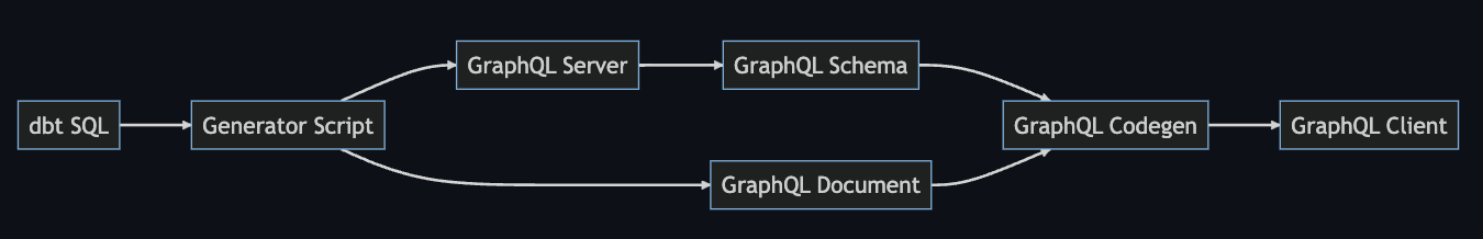 GraphQL サーバ (Python) と GraphQL クライアント (node.js) のコードをそれぞれスクリプトで生成しています。dbt Cloud を使って作成した SQL ファイルが models ディレクトリ以下に置いてあるものとします。コード生成スクリプトを実行すると GraphQL サーバと GraphQL クライアントのコードを生成します。