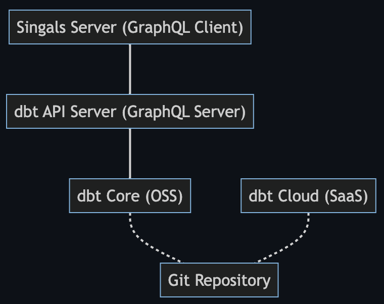 Signals サーバと dbt API サーバが GraphQL で通信します。dbt API サーバ自体はステートレスなのでデータベースを持たず dbt Core を通じて Git Repository (ワーキングディレクトリ)内の SQL ファイルを参照します。
