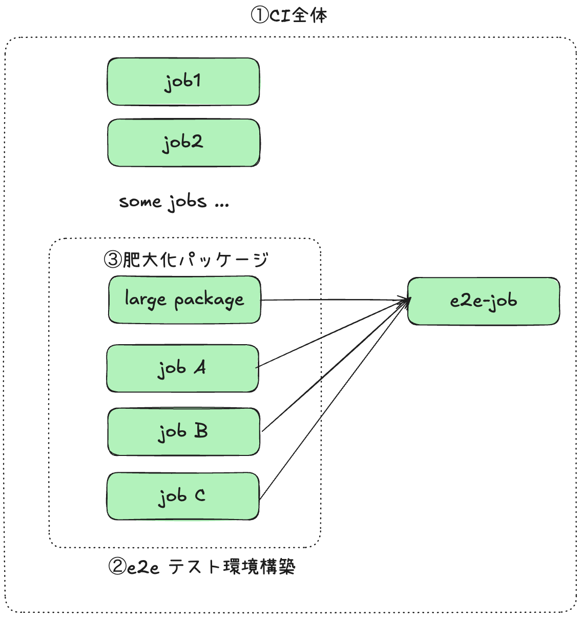CIでの改善は前述のローカル開発環境の改善と比較すると改善量はやや少なくなります。これはCIで複数のジョブが稼働しており今回の改善の影響をあまり受けないジョブもあるからです。(後述の図参照)