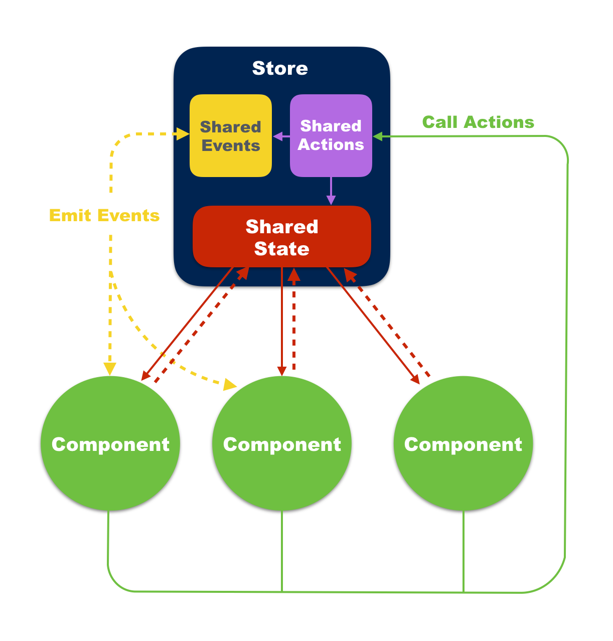 下図のように、ユーザーから何らかの入力を受けたコンポーネントはStoreの共有処理(Shared Actions)を直接Callすることで共有状態(Shared State)を更新します。各コンポーネントはこの共有状態を監視することでそれぞれの表示を変化させます。