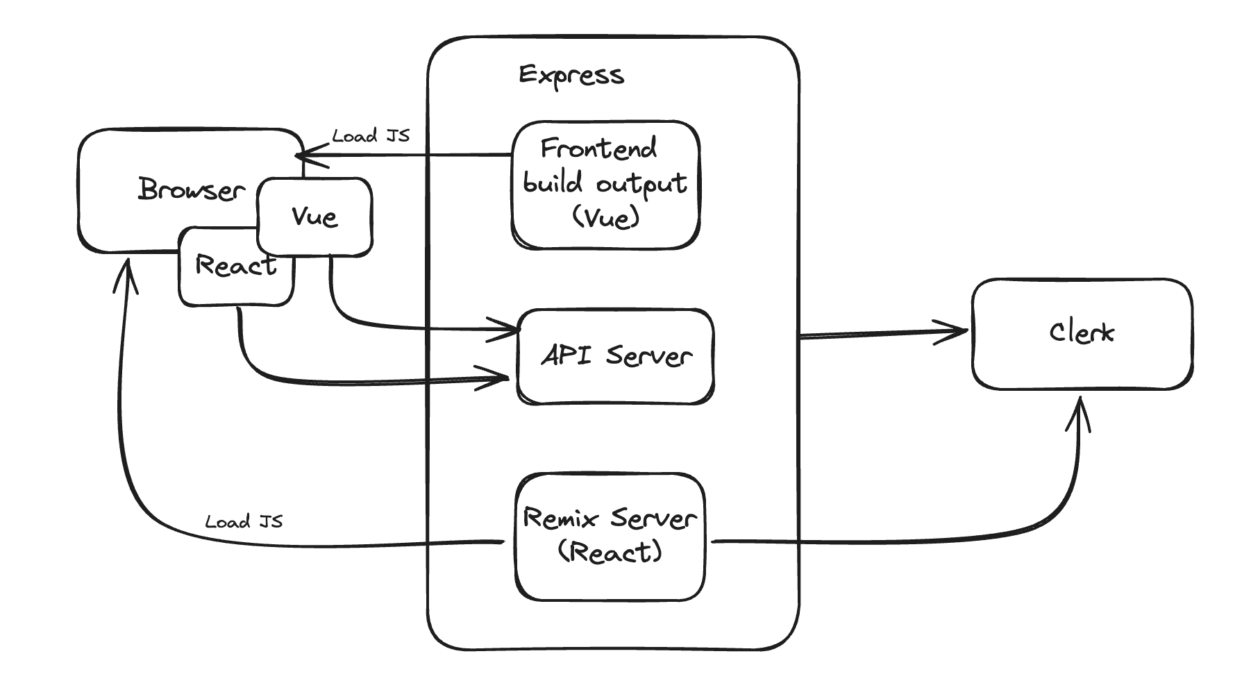 また図の通り、APIサーバへのリクエストはすべてブラウザ側からの経路に集約しており、ブラウザ側ではVueとReactの2枚のSPAが動き、Clerkによって認証チェックが行われるpublicなAPIがいるシンプルな形になっています。