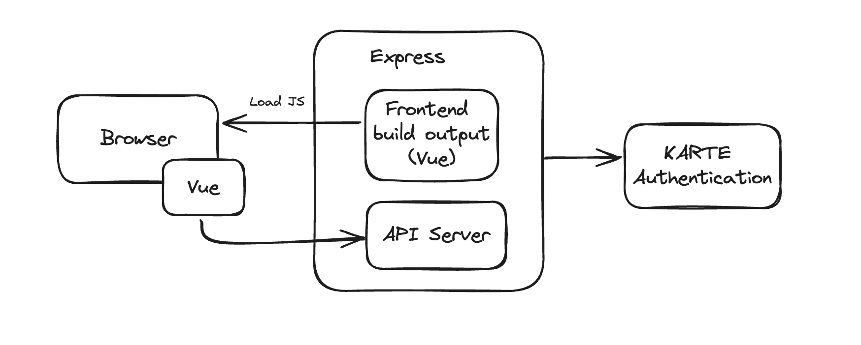 以前のWicleのシステムの前段部分の構成を簡略化したものです。Expressで一通りのAPIを実装しており、また特定のルーティングはVueで実装されたフロントエンドのビルド成果物を配信するWebサーバの役割を担っています。認証が必要なルーティングについてはExpressミドルウェアからKARTE側のサービスを通じて認証します。